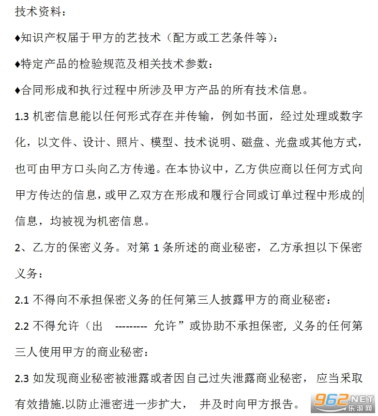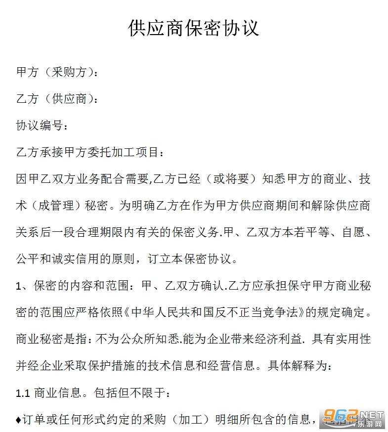 因甲乙双方业务配合需要,乙方已经(或将要)知悉甲方的商业、技术(成管理)秘密。为明确乙方在作为甲方供应商期间和解除供应商关系后一段合理期限内有关的保密义务.甲、乙双方本若平等、自愿、公平和诚实信用的原则,订立本保密协议。