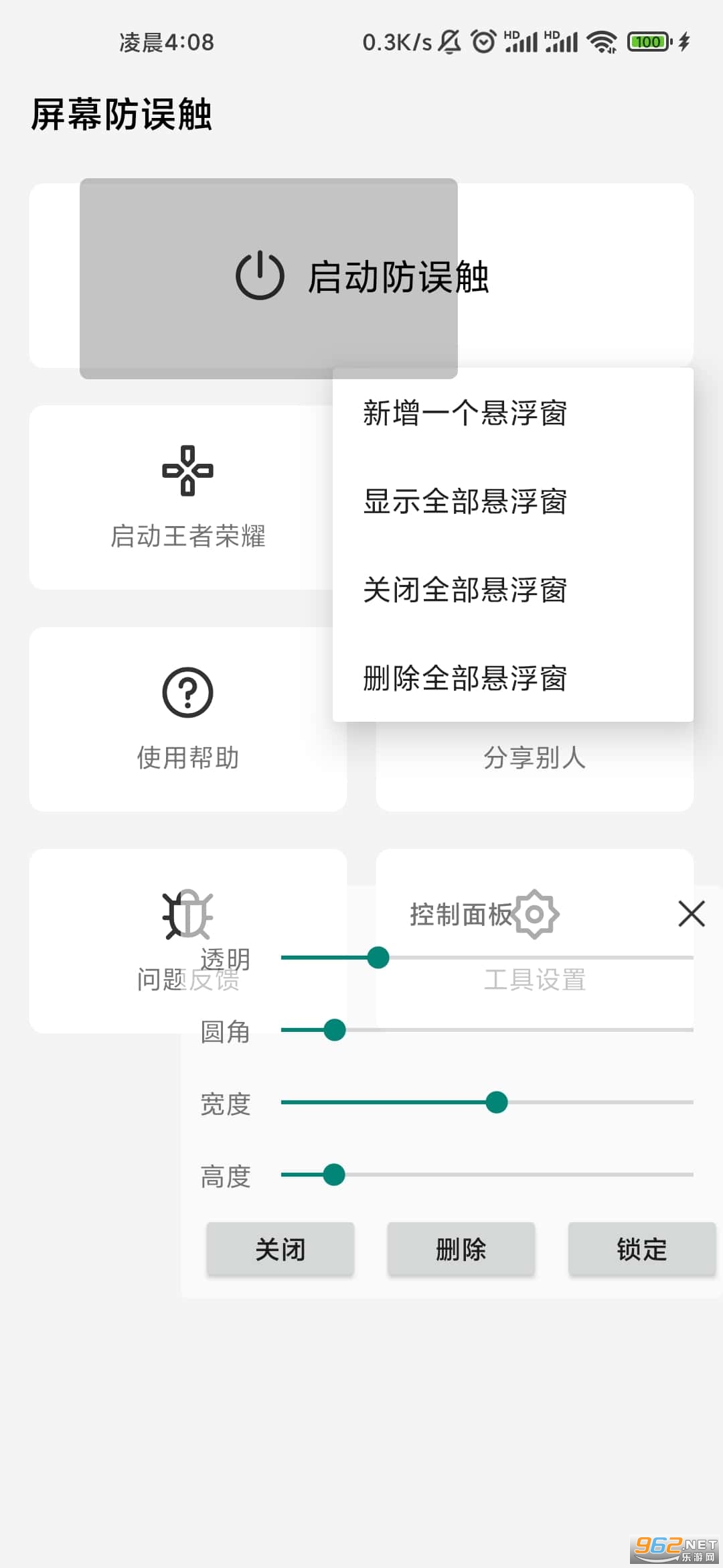 1.能够支持用户自定义悬浮窗来遮挡误触区域,在游戏或其他场景中屏蔽易误触区域;