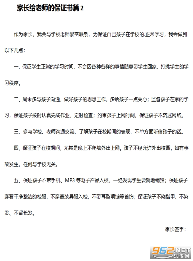 家长给老师的保证书篇2