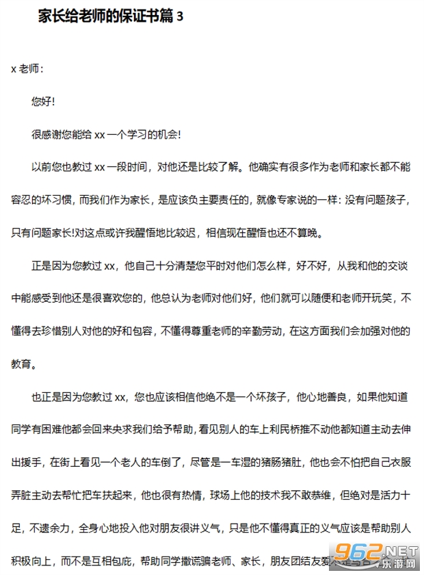 《家长保证书格式范文》为大家带来3份写给学校老师的家长保证书范文写法,分别是孩子犯错家长写的保证书以及保证一些学生的基本行为等,大家可以自行进行参考。直接下载压缩包进行解压就可以得到文档文本了哦。
