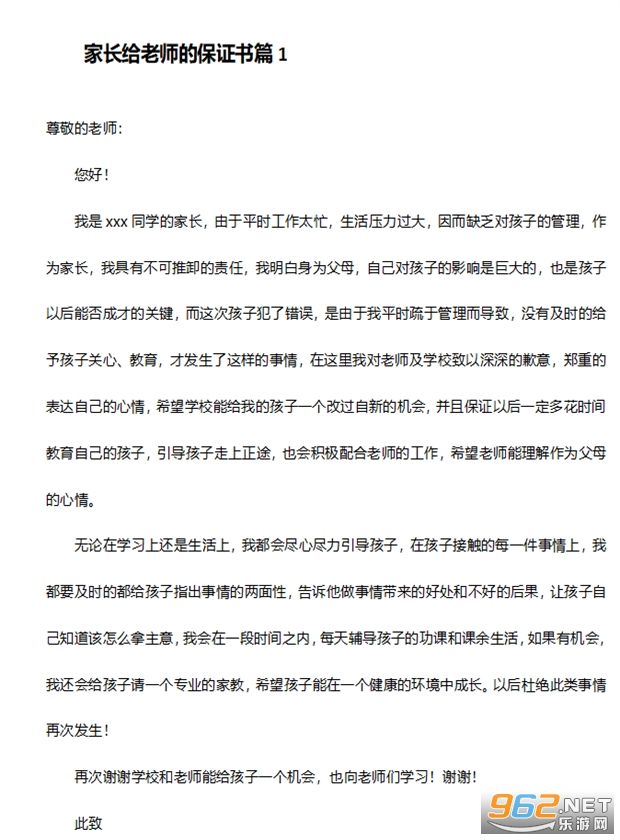 家长给老师的保证书篇1