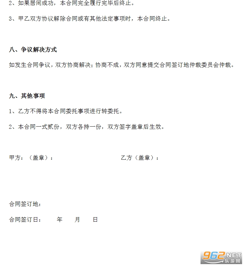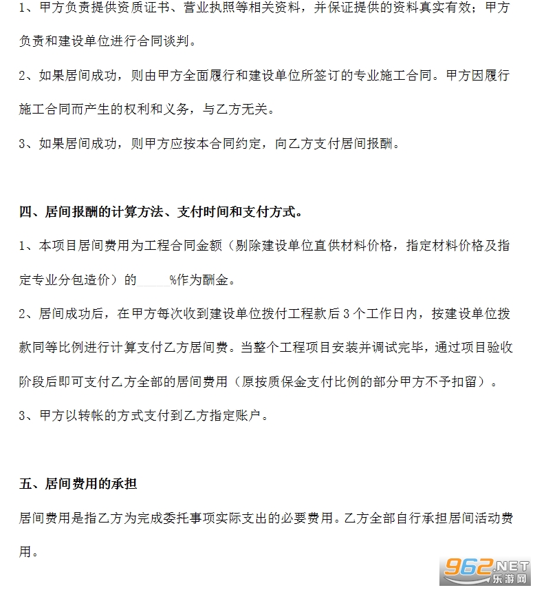2、“居间成功”是指完成本条所列全部委托事项。甲方与建设单位未签订书面的工程施工合同,乙方仅为甲方提供信息,或为甲方提供的联络、协助、撮合等服务的,均视为委托事项未完成。