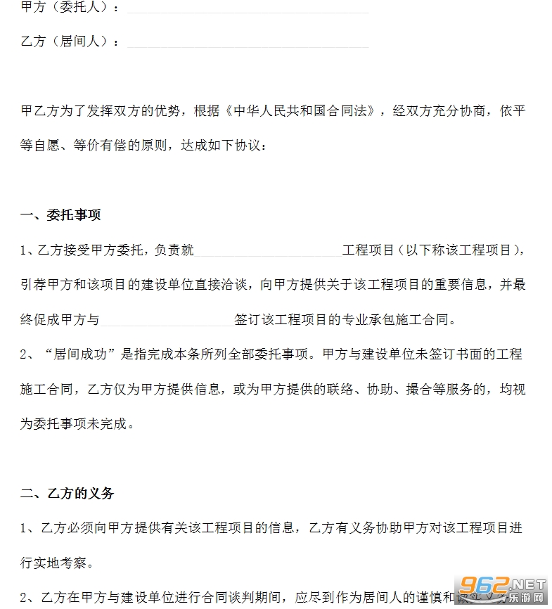 1、乙方接受甲方委托,负责就______________________工程项目(以下称该工程项目),引荐甲方和该项目的建设单位直接洽谈,向甲方提供关于该工程项目的重要信息,并最终促成甲方与____________________签订该工程项目的专业承包施工合同。
