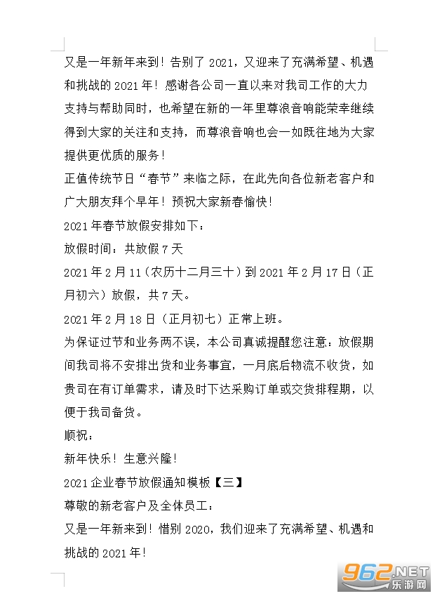 2026企业春节放假通知模板【三】