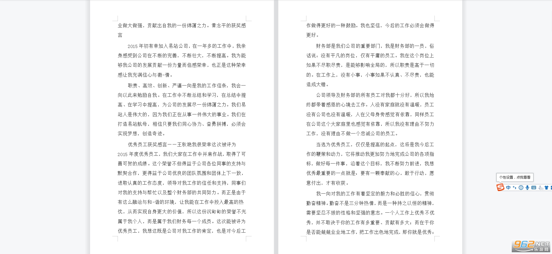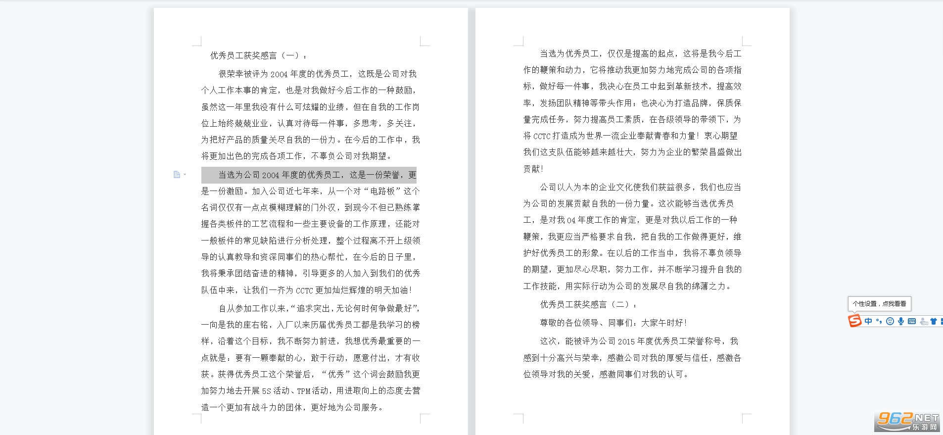 很荣幸被评为2004年度的优秀员工,这既是公司对我个人工作本事的肯定,也是对我做好今后工作的一种鼓励,虽然这一年里我没有什么可炫耀的业绩,但在自我的工作岗位上始终兢兢业业,认真对待每一件事,多思考,多关注,为把好产品的质量关尽自我的一份力。在今后的工作中,我将更加出色的完成各项工作,不辜负公司对我期望。