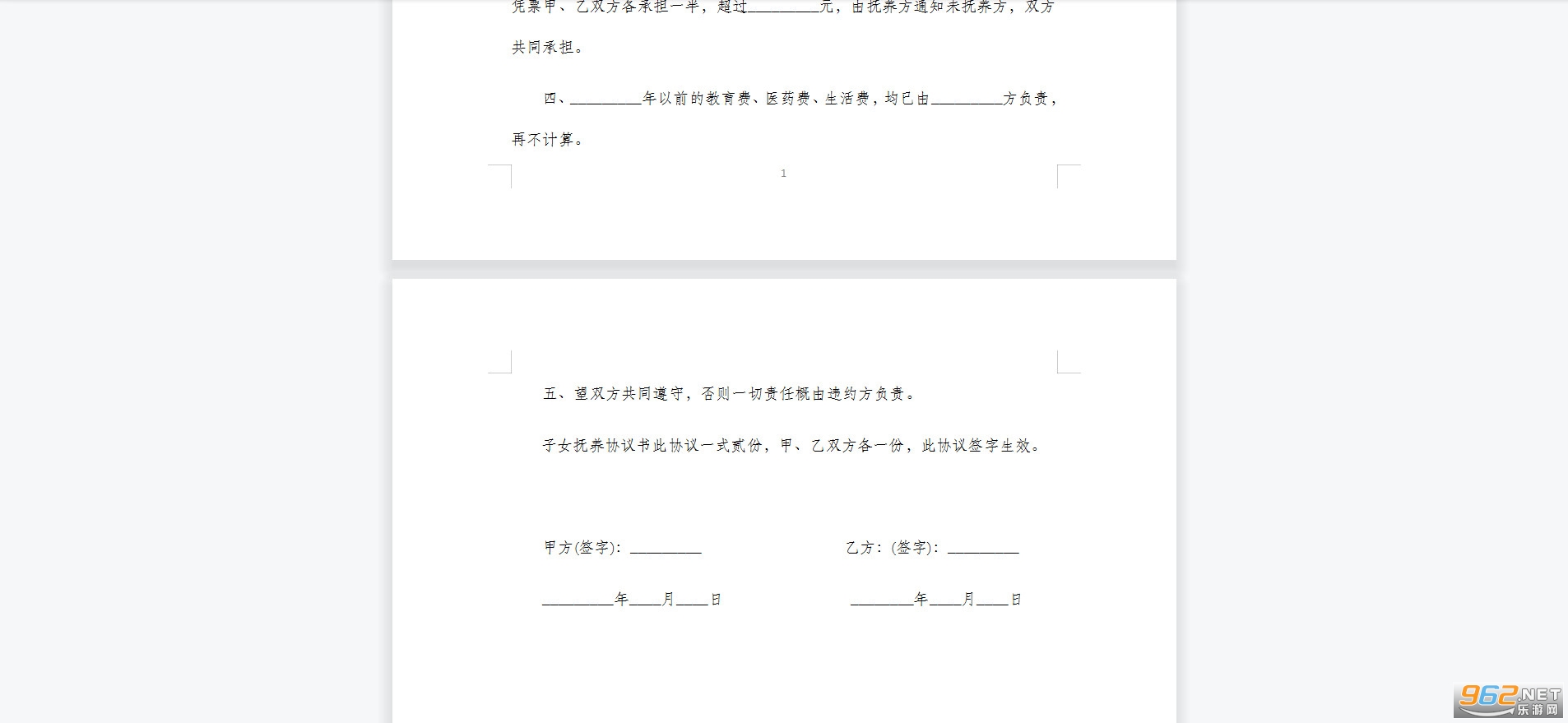 子女抚养协议书此协议一式贰份,甲、乙双方各一份,此协议签字生效。
