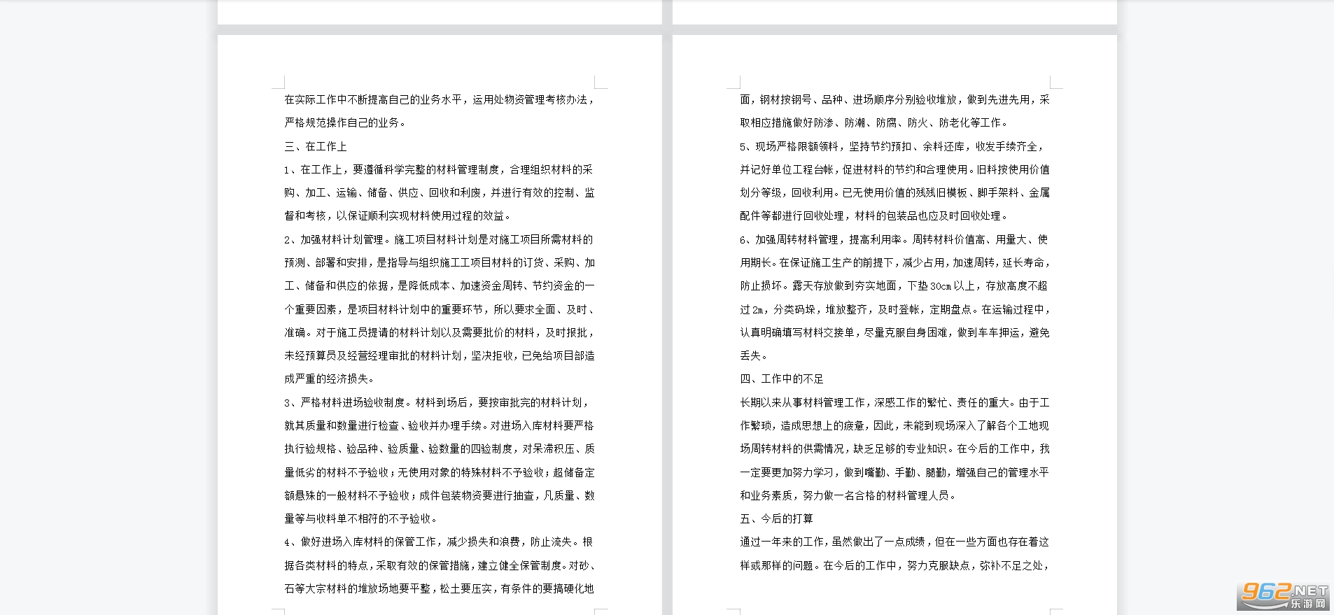 长期以来从事材料管理工作,深感工作的繁忙、责任的重大。由于工作繁琐,造成思想上的疲惫,因此,未能到现场深入了解各个工地现场周转材料的供需情况,缺乏足够的专业知识。在今后的工作中,我一定要更加努力学习,做到嘴勤、手勤、腿勤,增强自己的管理水平和业务素质,努力做一名合格的材料管理人员。