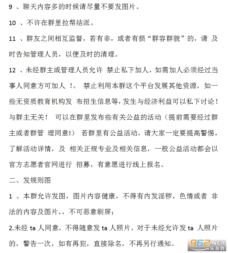 12 、未经群主或管理人员允许 禁止私下加人,如需加人必须经过当事人同意方可加人 !。 禁止利用本群这个平台发展其他资源,如一些无资质教育机构发 布招生信息等,发生与经济利益可以私下讨论!与群主无关! 可以在群里发布些有关公益的活动(提前需要经过群主或者群管 理同意!) 若群里有公益活动,请大家一定要提高警惕,了解活动详情,及 相关正规专业及相关信息,一般公益活动都会以官方志愿者官网进行 招募,有意愿进行线上报名。