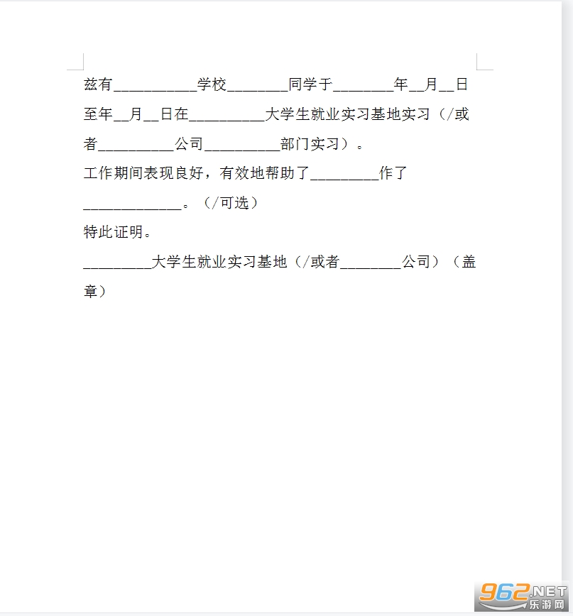 兹有_________学校_________专业_________同学于_________年_________月_________ 日至_________年_________月_________日在_________实习,该同学的实习职位是_________。该学生实习期间工作认真,在工作中遇到不懂的地方,能够虚心向富有经验的前辈请教,善于思考,并能够举一反三。对于别人提出的工作建议,可以虚心听取。在时间紧迫的情况下,加班加点完成任务。能够将在学校所学的知识灵活应用到具体的工作中去,保质保量完成工作任务。同时,该学生严格遵守我公司的各项规章制度。实习时间,服从实习安排,完成实习任务。尊敬实习单位人员。并能与公司同事和睦相处,与其一同工作的员工都对该学生的表现予以肯定。
