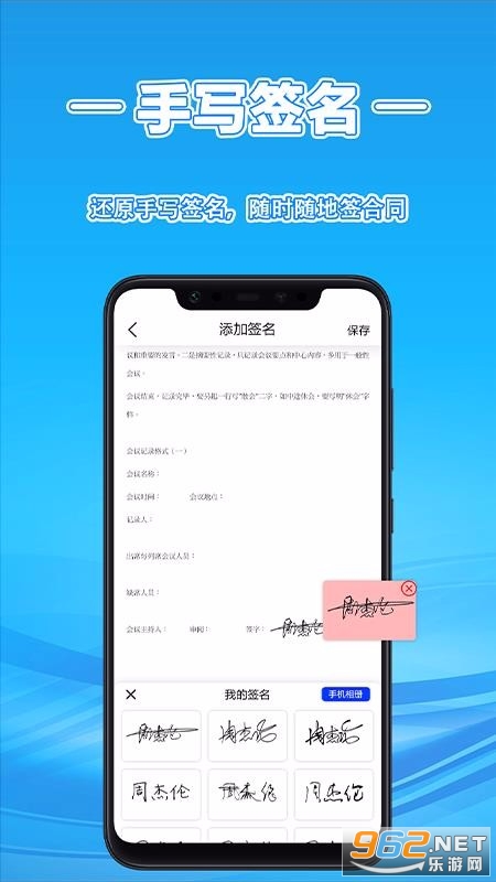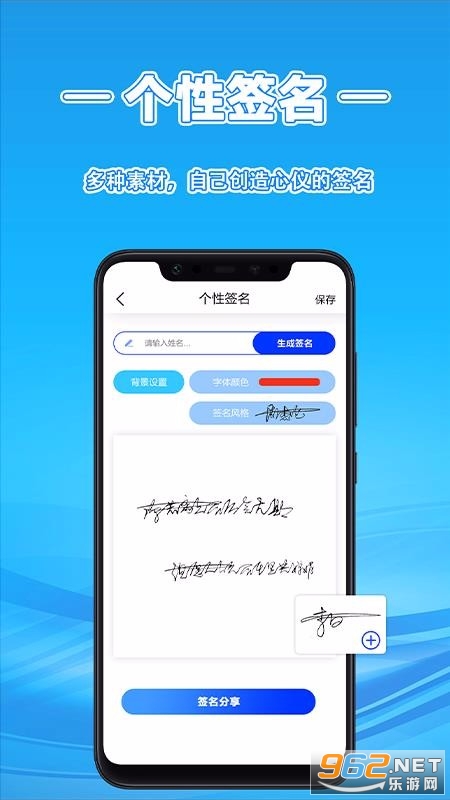 一款非常实用的签名设计app,里面有个性签名、简易签名以及自由签名等多种不同的设计服务专区,同时还为用户展示了丰富的签名样式模板;这里有自由的签名定义设计工具,里面设置了空白的模板,用户可以在白板上自由的签字书写,发挥自己的个性化签名特点,签写出属于自己风格的作品,此外还为用户提供画笔颜色以及背景颜色等复制设置功能,可以在个性化签名内容前提下添加更多的精美样式效果;在这里制作好的签名不仅能分享给好友,还能将其保存下来并运用到合同签字方面,为电子合同审签提供便捷。