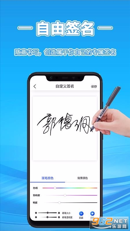1、拥有多种自定义签名编辑功能,里面提供了背景颜色、笔画颜色的摄像、饱和度以及透明度等工具;