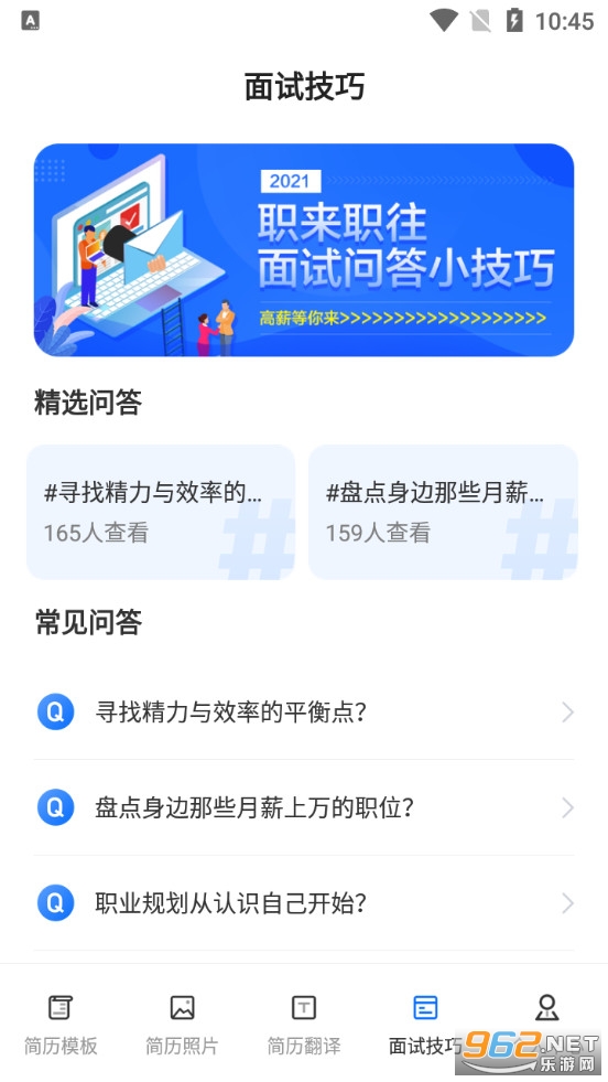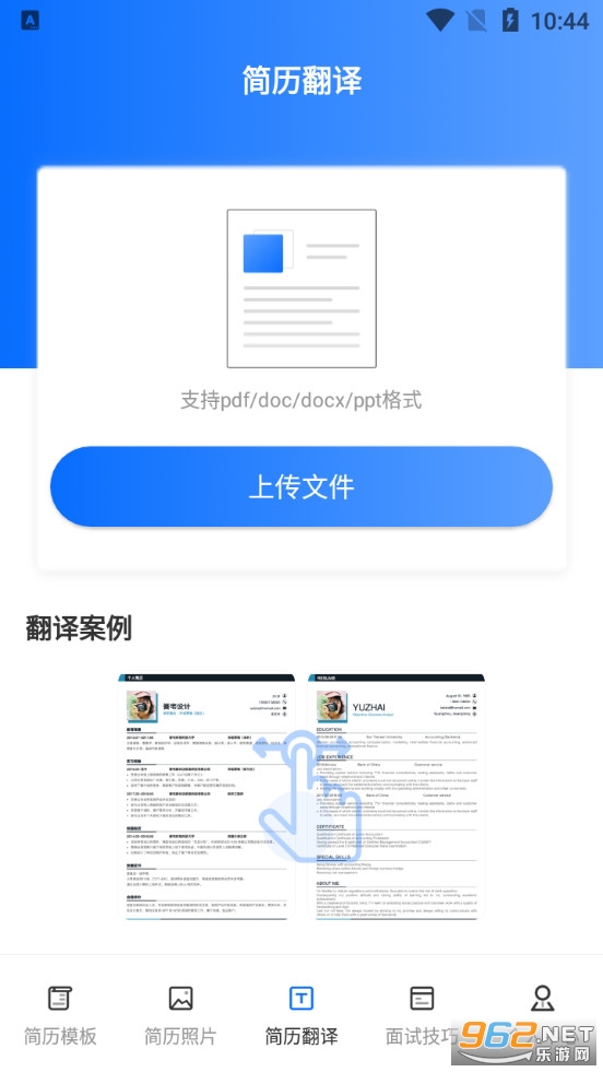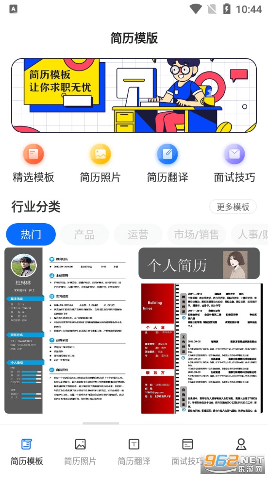 不错的简历制作软件,收录了各行各业的简历模板,朋友们可以选择自己需要的去参考借鉴,还可以在软件拍摄简历的照片,可以将简历翻译成英文等,有需要的朋友可以下载试试。