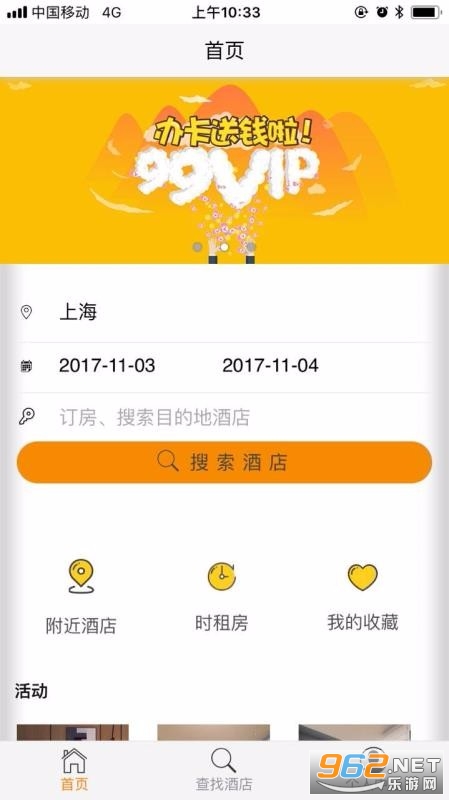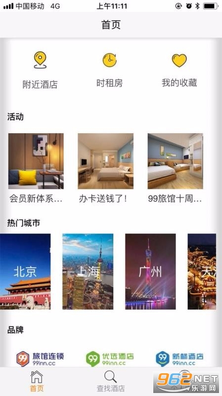 ·便捷的酒店服务功能专区,首页设置了附近酒店、时租房以及我的收藏多种功能图标;