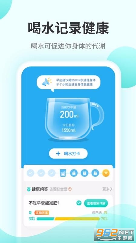2、科学的饮水健康建议,在喝水打卡里面还向用户展示了温馨的健康喝水提示;