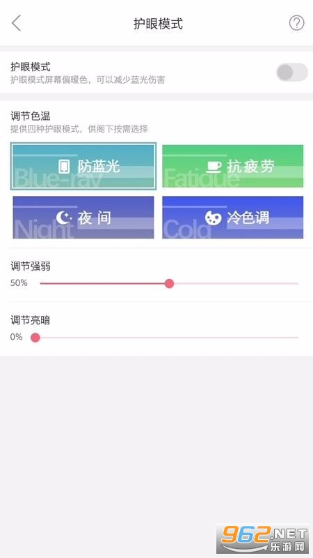 3、提供四种不同的护眼模式,同时在护眼模式中为用户提供了防蓝光、抗疲劳以及冷色调等多种不同模式选择标签;