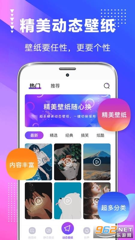《主题壁纸美化大全手机版》是一款非常给力的手机壁纸软件,这里为用户提供海量的壁纸软件,可以随意的进行使用,实时的满足用户的选择需求,让用户在平台里能够了解各种壁纸信息,而且还是免费的,感兴趣的朋友欢迎来962下载试试吧!