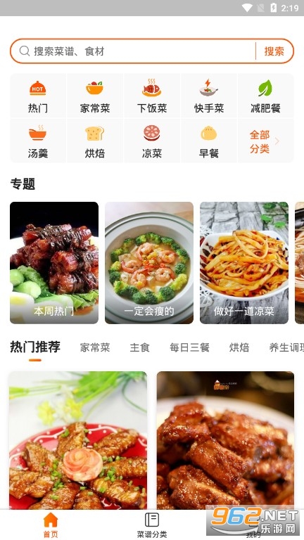 1、一键搜索菜谱大全功能,可以直接输入想吃的蔬菜名称、各类食材,一键快速搜索美食菜谱。