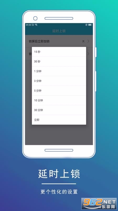 5、自定义退出应用后上锁的时间,有立即、15秒、30分钟等;