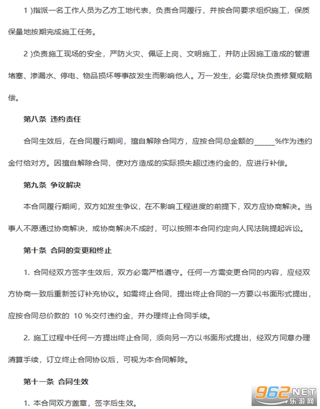 第八条 乙方应当遵守施工安全操作规程,采取必要的安全防护和消防措施,保证作业人员安全,避免甲方房屋和其他财产的损失。