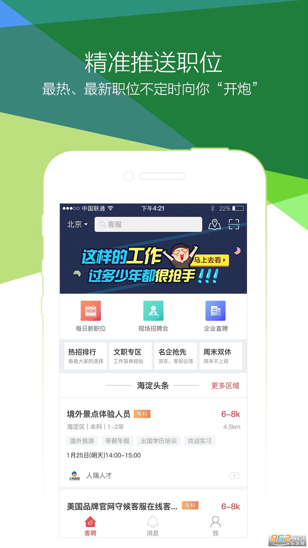 「 香聘 」专注服务于「 年轻 」朋友们求职找工作的招聘app软件,协助你在「 1-2天 」内秒速找到工作!