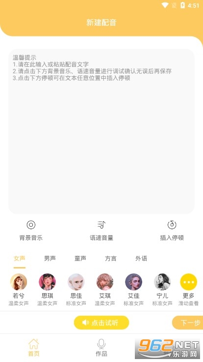《智能配音大师》是一款多功能手机配音软件,直接将要配音的文字输入对话框,然后点击下方音效和背景音乐就可以开始配音了,并且在配音编辑的时候,点击停顿就可以插入任意对话框,还可以调整音量和语速,整体的操作还是非常人性化的。