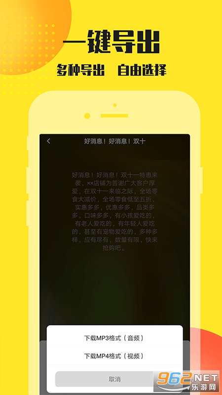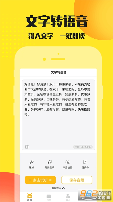 广告配音大全是一款专业广告叫卖配音、文字转语音、语音合成、在线朗读的APP软件。输入文字秒转语音,免费试听,在线导出。