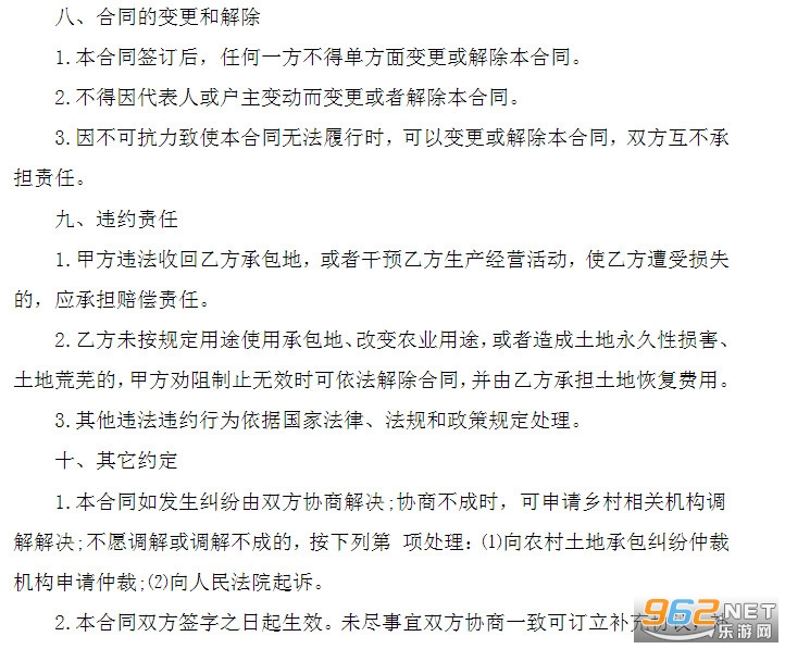 5、本协议自双方签字后生效。经协商,决定 ;(是或否)鉴证。未尽事宜,由双方共同协商补充,并报村和乡(镇、街道)备案,有关补充条款与本合同具有同等法律效力。
