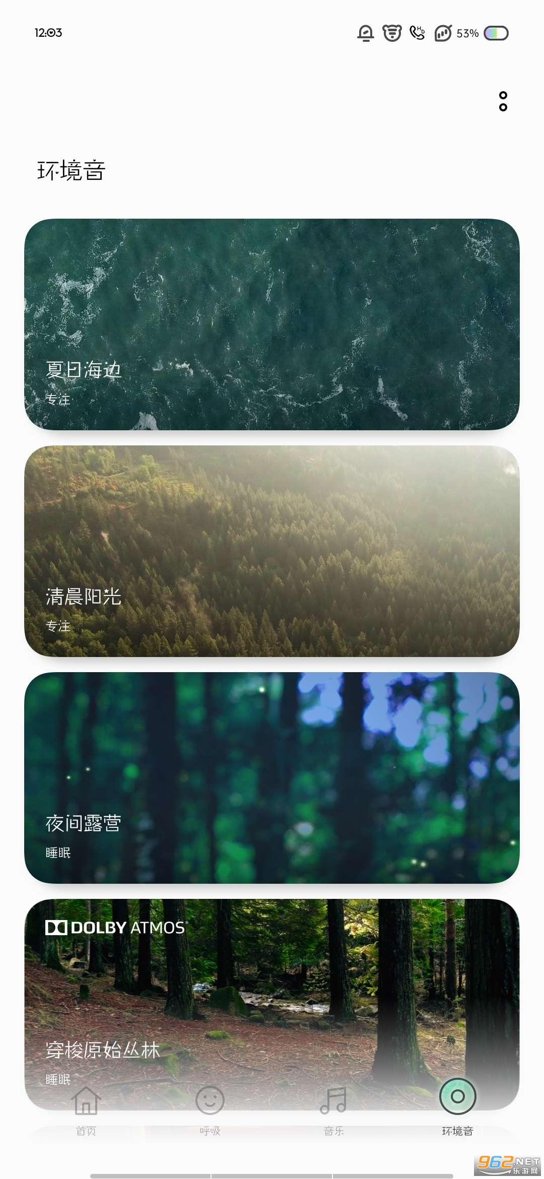 1、目前包括四个板块:首页、呼吸、音乐、环境音。