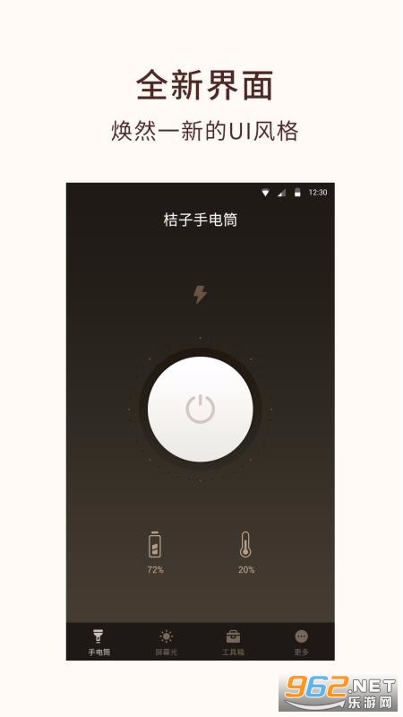 1 手电筒照明,一键开关手电筒,震动反馈,同时显示手机剩余电量,手机温度