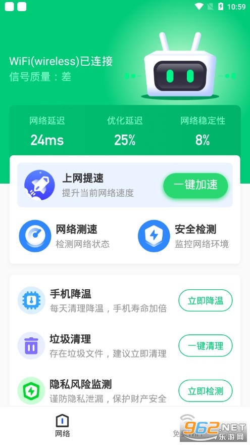 有了这款软件之后我们就可以轻松上网了,一键扫描寻找身边的无限网络,立马为你链接网络状况好的wifi,另外这款软件还有垃圾清理和手机降温的功能,功能还是挺多的,绝对能满足用户们的需求。