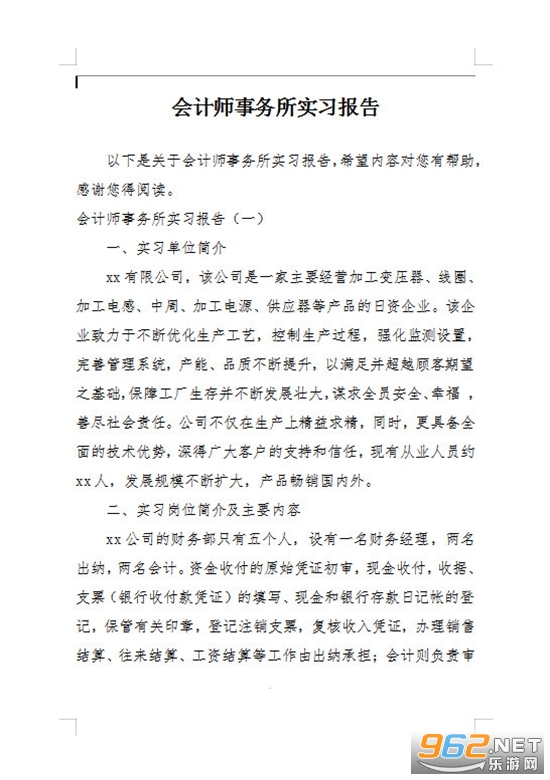 《会计师事务所实习报告模板》是一套为在会计师事务所实习的朋友制作的报告总结,在实习完成后有时候需要写一个实习报告,一些朋友不知道该怎么来写,可以按照一些要求来选择自己的字数范围,写自己的经历、工作内容、收获等等,小编收集整理了三份实习报告供大家参考。