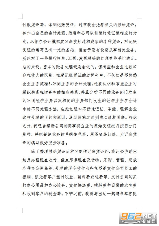 初到企业,首先要做的是把企业日常较多使用的会计业务及其财务资料认真读透,包括原始凭证、记账凭证、财务规章制度等。在刚进入财务部的第一周中,主要是看企业的记账凭证,例如现金收款凭证,现金付款凭证,银行收款凭证,银行付款凭证等。拿到记账凭证,通常我会先看相关的原始凭证,并作出自己的会计处理,然后和公司以前做的凭证做相应的对比。尽管在会计模拟实习课接触过相类似的各种凭证,对记账凭证的填写已有一定的基础,但由于没有长期从事相关业务,所以对于一些银行帐单、汇票、发票联等的处理有些手忙脚乱。总的来说,基本的账务处理还是会做的,但有些和企业比较却存在较大的区别。在看记账凭证的过程当中,不仅仅是要熟悉企业业务流程和不同业务的会计处理,还要认识和掌握企业的组织关系在财务中的相应关系,并且分析不同的业务部门发生的不同经济业务以及相同的业务部门发生的经济业务在会计中的不同处理方法,在此过程中不断地记忆、掌握、理解企业这样处理的目的和原因,遇到困惑之处则虚心请教同事。除此之外,我还会帮助公司的同事将企业的原始凭证按月按日分门别类,并把每笔业务的单据整理好,用图钉装订好,为记账凭证的填写做好充分准备。