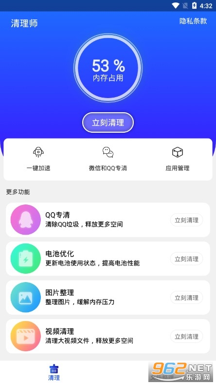 《清理师》是一款专业的手机极速清理软件,一键就能手机垃圾清理,瞬间释放手机的内存,让你的手机运行起来更加流畅,这款软件还自带电池管理功能,可以帮助我们智能省电保护电池,延长手机的使用寿命,后台软件管理功能也是大家常用的功能,可以直接在这里管理手机上所有的应用软件。