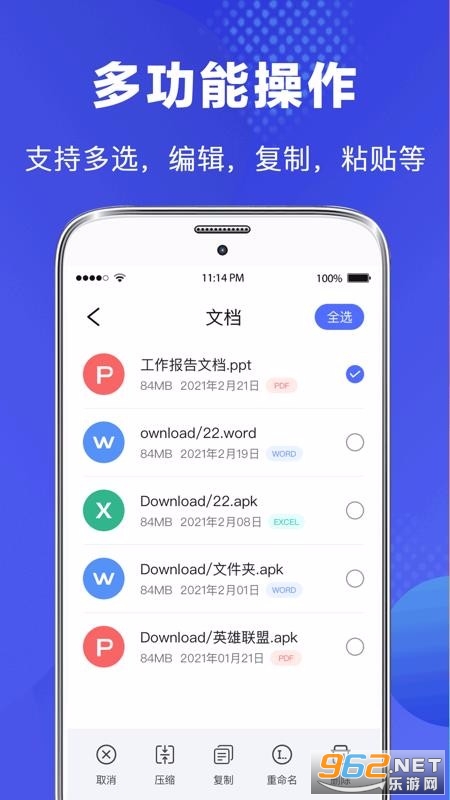 1、丰富的文档处理工具,该工具栏中有压缩、复制、重命名以及删除多种工具;