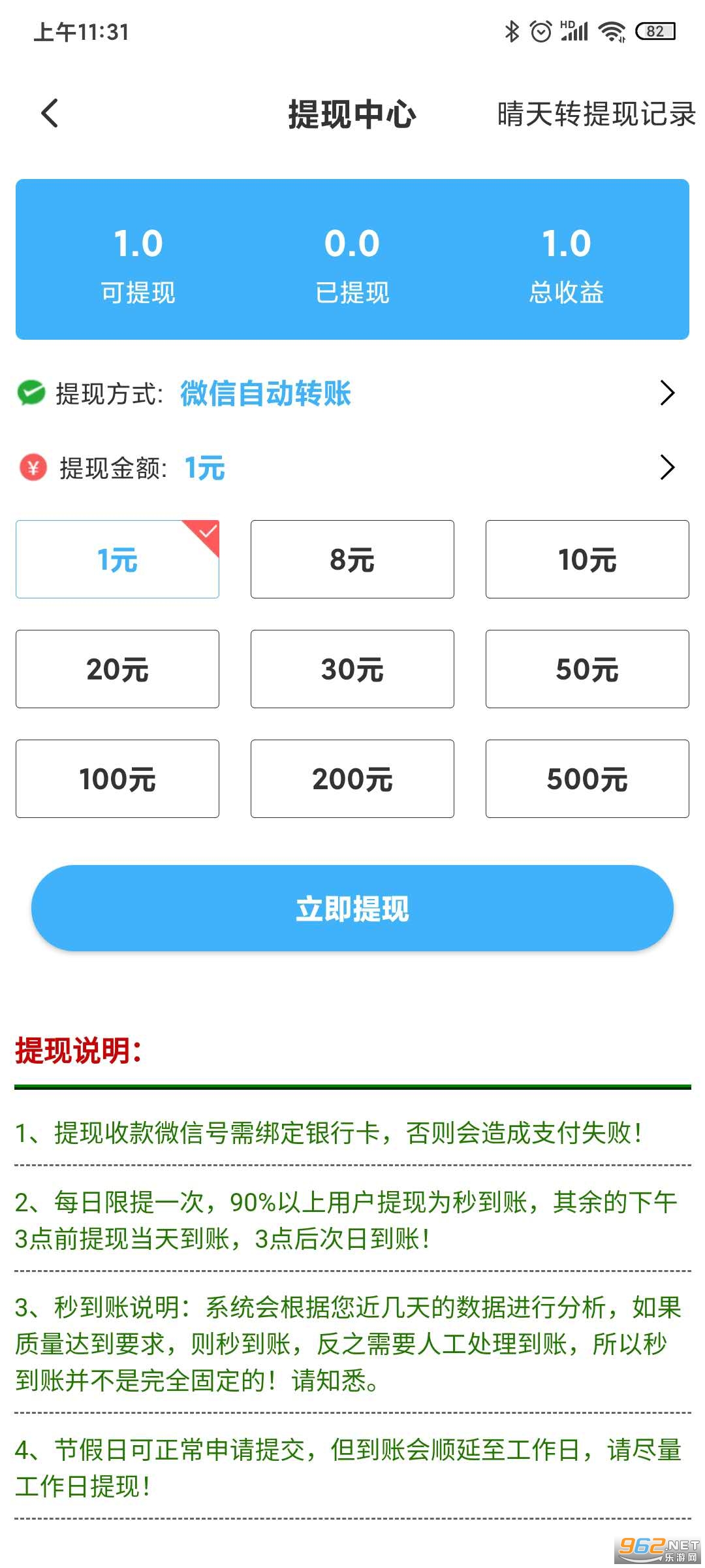3、晴天转收入满10元可申请提现至零钱,90%以上用户秒到账,最慢不超过24小时