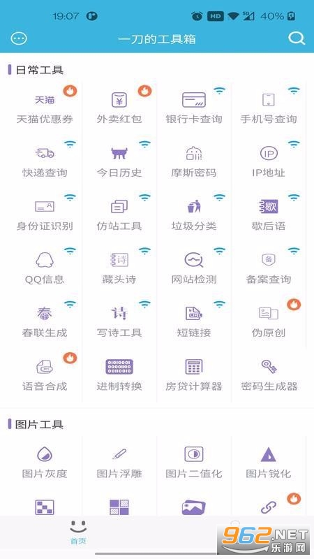 一个实用的多功能工具大全app,里面拥有日常工具、图片工具以及PDF等常用的工具应用,每种工具里面还设置更多的小工具内容;用户在手机上安装该软件后就等于安装了天猫、快递以及垃圾分类等多种应用软件,可以帮助用户轻松识别区分不同的垃圾,还能利用里面的语音合成工具将不同的语音内容合成另一个文本,此外还设置了摩斯密码以及备案查询等众多常用工具应用;上面的工具划分清晰,其工具图标丰富多样,工具内容非常丰富,还将许多热门的工具突出展示,在这些工具上面设置了热门的提示图标。
