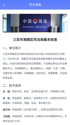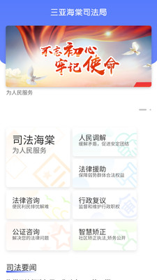 司法海棠APP包含三亚市海棠区司法局简介、人民调解、法律援助、法律咨询、行政复议、公证咨询、智慧矫正等功能。