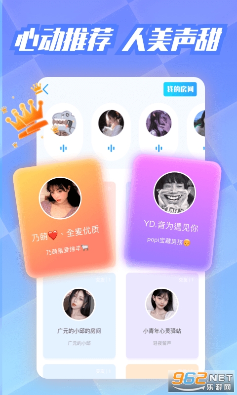 一款高质量的语音交友软件,它聚集了众多可爱的小哥哥小姐姐,每一个用户都可以通过声音和他们交流,也可以通过暖心树洞、电台直播、剧本杀、谁是卧底等社交方式,在游戏娱乐中结识到更多有趣的灵魂,为用户打造了一个轻松的交友环境,认识朋友变得更加的方便;除此之外,该应用还拥有超多的大神陪玩入驻,囊括了各大热门手游,用户可根据游戏类型以及风格,分分钟匹配到声音好听以及技术高超的游戏陪玩,与他们共同的畅玩游戏,让用户能得到更加具有趣味性的游戏体验;如果有需要,就赶快下载使用吧。