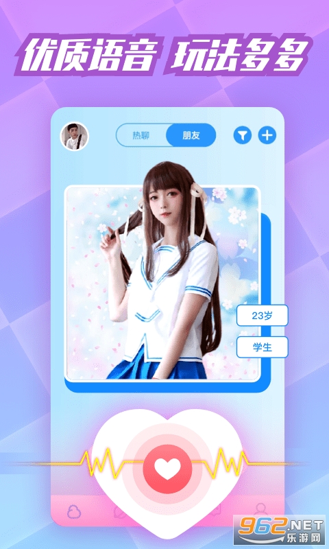 《耳聊陪玩语音聊天APP》是一款非常给力的美女恋爱交友平台,上面汇集了非常多的单身人士,平台会通过非常专业的人工审核,通过人工智能筛选帮用户挑选出来,自己感兴趣的知己,可以让你们互相认识成为朋友,感兴趣欢迎来962下载试试吧!