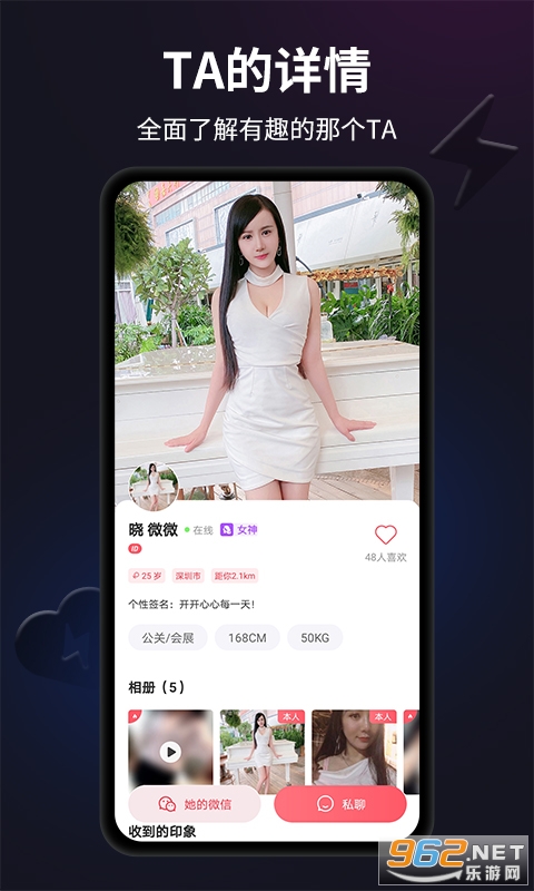 《小莉鸭交友最新版》是一款非常好用的美女聊天交友平台,操作非常方便,安装也简单,超多美女帅哥等你来撩,而且无需任何门槛,海量真实用户资料,严格审核资料,高质量人群约会聚集地,感兴趣的朋友还在等什么?欢迎来962下载吧!