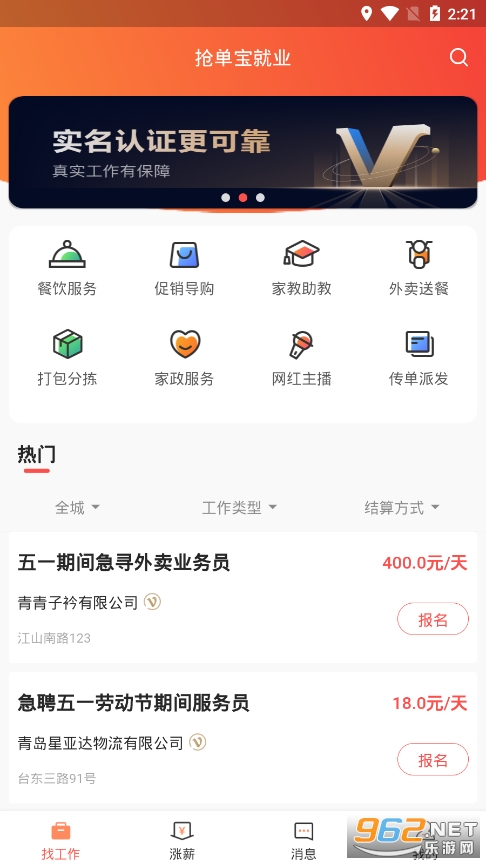 【抢单宝就业】是一款专门针对灵活用工免费找工作的手机软件,企业实名入驻平台,工作审核发布,真实有保障。用工双方线上联系,快速了解,在线面试,入职招人更高效!