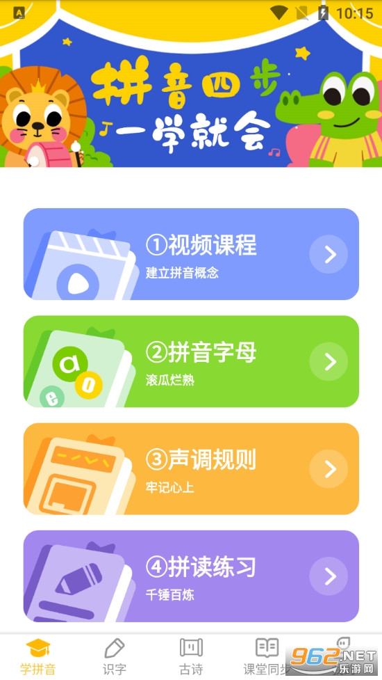 拼音学习软件,有着拼音字母学习、声调练习、拼读练习等众多不同的模块,可以学习拼音和汉字,还可以学习古诗,同步课堂,有需要的朋友可以下载试试。