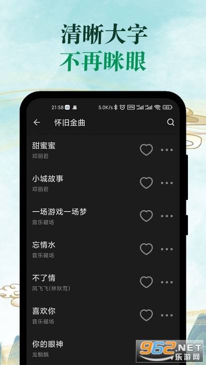想听什么音乐直接搜索就能找到,每天还有超多经典歌曲为你推荐,系统还能自动记录我们的最近播放,就算不小心手滑退出去也能找到,遇到好听的音乐,可以直接点击红心收藏,下次可以直接听。