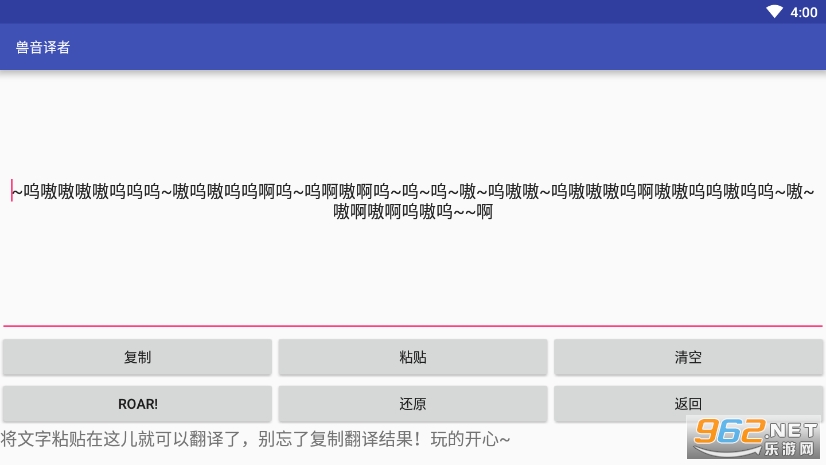《嗷呜翻译器app》(Roar Translater)又名《兽音译者》,是一款比较有趣的恶搞神器。用户朋友们可以通过嗷呜翻译器讲一段正常的文字翻译成嗷呜嗷呜嗷呜等等一连串看起来非常奇怪的兽语,向你的朋友传递密语,进行文本加密,也可以通过此软件将嗷呜嗷呜等各种奇葩的兽语翻译成正常的文字,超级神奇!
