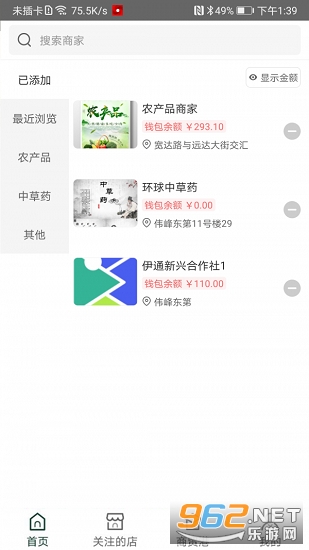 2、可显示出账户钱包余额,能从中获取商家列表