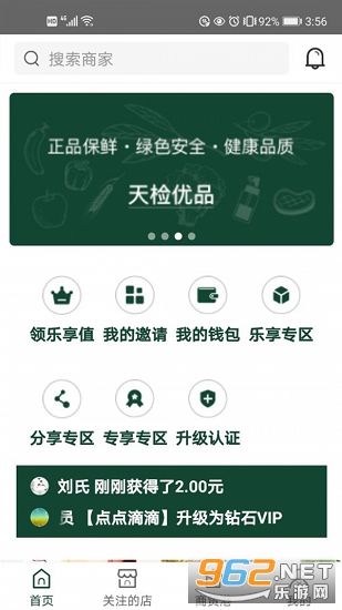 2、进入首页中,可以查看我的邀请、我的钱包、乐享专区、升级认证等信息