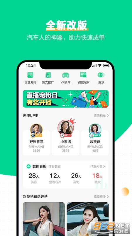 此APP是太平洋汽车网面向汽车行业人士打造的营销神器,提供汽车热点海报、行业热文推送、H5营销素材、车型展示、竞品对比、一键联系等功能,方便客户看车询价,助您成为汽车营销好手。