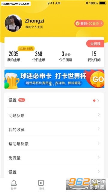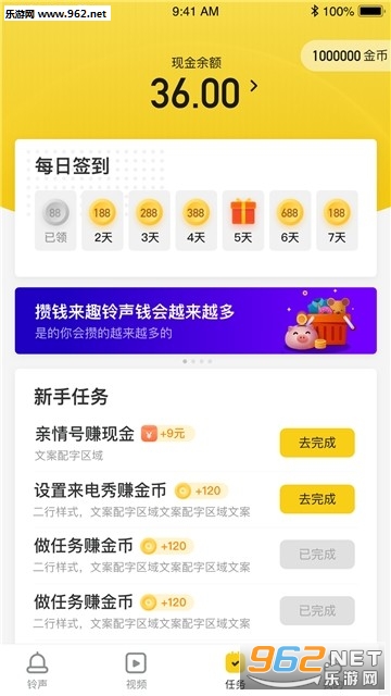 一款铃声赚钱软件,海量铃声你可以随意选择,每天都会有大额红包和福利等你领取,享受轻松赚零花钱的无上体验,快来试试吧!
