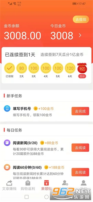 1、新用户下载注册淘淘转app就送2888元金币(相当于0.288元),转发文章单价0.32元/阅读