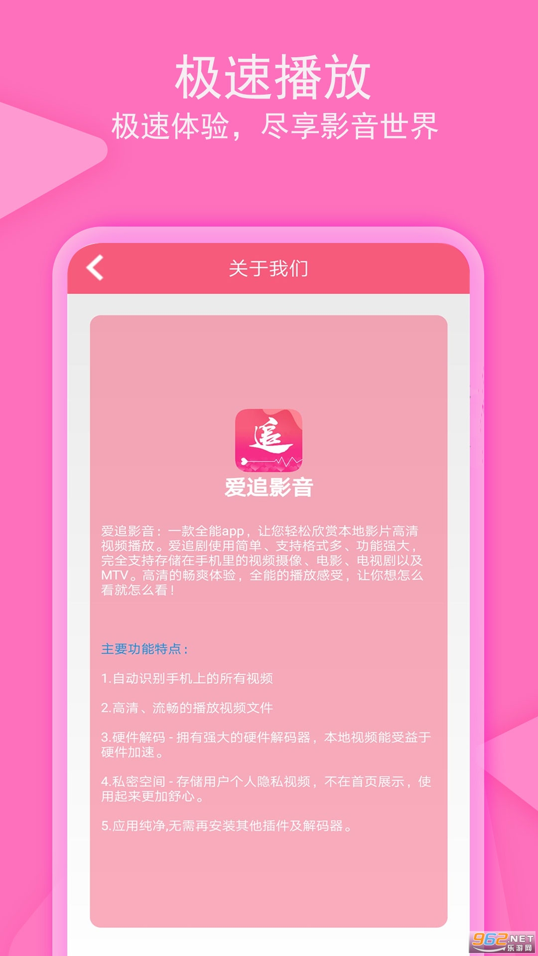 爱追剧影音:一款全能app,让您轻松欣赏本地影片高清视频播放。爱追剧影音使用简单、支持格式多、功能强大,完全支持存储在手机里的视频摄像、电影、电视剧以及MTV。高清的畅爽体验,全能的播放感受,让你想怎么看就怎么看!